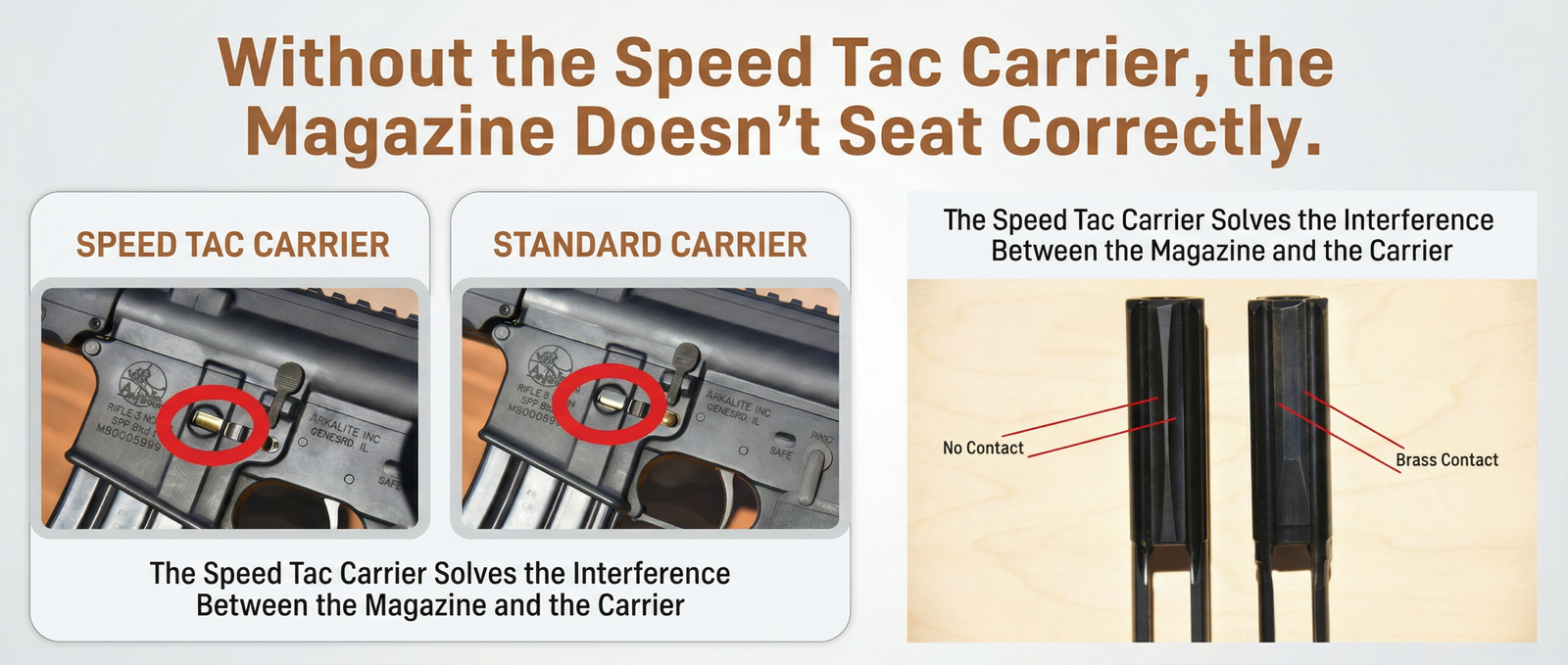 Seat a fully loaded AR-15 magazine on a closed bolt without the slam. The SPEED-TAC patented carrier design helps you get a more consistent seat and latch engagement with less force.